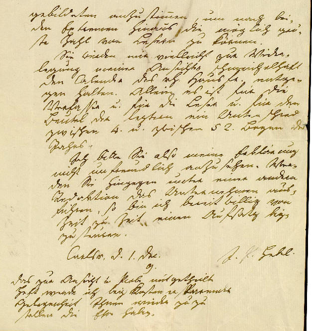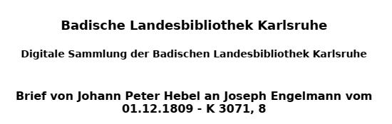 gebildeten anzustimen, um nach bei- den Extremen hinaus die möglich grö- ste Zahl von Lesern zu ködern. Sie würden mir vielleicht zur Wider- legung meiner Ansichten schmeichelhaft den Kalender des rh. Hausfr. entge- gen halten. Allein es ist für die Verfasser u. für die Leser u. für den Beutel der lezteren ein Unterschied zwischen vier u. zwischen 52 Bogen des Jahres. Ich bitte Sie also meine Erklärung nicht unfreundlich anzusehen. Wür- den Sie hingegen unter einer andern Redaktion das Unternehmen aus- führen, so bin ich bereit willig von Zeit zu Zeit einen Aufsatz bei- zusteuern. Carlsr. d. I. Dez. J. P. Hebel 9 Das zur Ansicht u. Probe mitgetheilte Heft werde ich bei Kosten u. passender Gelegenheit Ihnen wieder zu zu stellen die Ehre haben. |