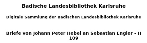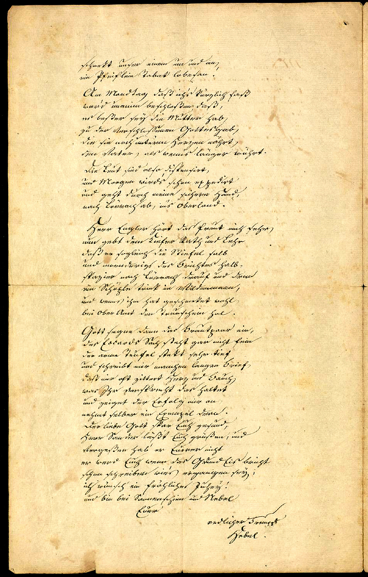 schmekt unser einem um und an, ein Pfeiflein Tabak lobesan. Am Mondtag, daß ich's kürzlich faß, ward unanim beschlossen daß, es besser sey die Mutter hab, zu der verschloßenen Gottesgab, die sie noch unterm Herzen nährt, den Vater, als wenns länger währt. Die Leut sind also dispensirt, und morgen wirds schon expedir t und geht durch meine sichre Hand, nach Lörrach ab, ins Oberland. Herr Engler hört das freut mich sehr, und gebt dem Kiefer Rath und Lehr daß er sogleich die Stiefel salb und mornderigs des Brichtes halb, spazier nach Lörrach drauf und dran ein Schöple trink im Wildenmann, und wenns ihm hat geschmeket wohl, bei Ober Amt den Trauschein hol. Gott segne dann das Brautpaar ein, Des Eccards Sach steht gar nicht fein der arme Teufel stekt sehr tief und schreibt mir manchen langen Brief, daß mir oft zittert Herz und Bauch, was Ihr versprecht das haltet Und zeiget den Verfolg mir an, nehmt selber ein Exempel dran. Der liebe Gott spar Euch gesund, Herr Sander läßt Euch grüßen, und vergessen hab' er Euerer nicht er werd Euch wenn das Grund Eis bricht schon schreiben wie's ergangen sey ; ich wünsch' ein fröhliches Juhey! und bin bei Sonnenschein undNebel Euer redlicher Freund Hebel. |