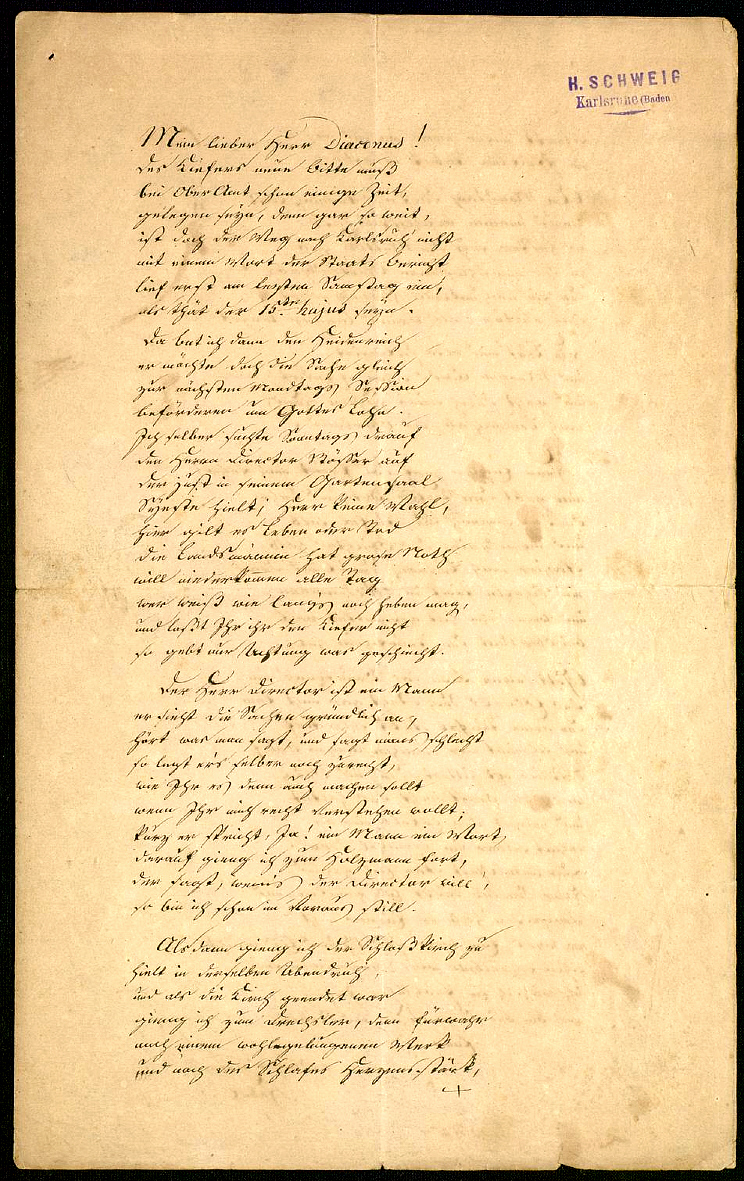 Mein lieber Herr Diaconus! Des Kiefers neue Bitte muß beim Oberamt schon einige Zeit, gelegen seyn, denn gar so weit, ist doch der Weg nach Karlsruh' nicht mit einem Wort der Staats Bericht lief erst am letzten Samstag ein, als thät der 15te kajus seyn. Da bat ich denn den Heidenreich er möchte doch die Sache gleich zur nächsten Montags Session beförderen um Gottes Lohn. Ich selber suchte Sonntags drauf den Herrn Director Stößer auf der iust in seinem Gartensaal Syesta hielt; Herr keine Wahl, hier gilt es Leben oder Tod die Landsmänninn hat grose Noth will niederkommen alle Tag wer weiß, wie lang's noch heben mag, und laßt Ihr ihr den Kiefer nicht so gebt nur Achtung, was geschiecht. Der Herr Director ist ein Mann er sieht die Sachen gründlich an, hört was man sagt, und sagt mans schlecht so legt ers selber noch zurecht, wie Ihr es denn auch machen sollt wenn Ihr mich recht verstehen wollt. Kurz er spricht, Ja! ein Mann ein Wort, darauf ging ich zum Holzmann fort, der sagt, wenns der Director will, so bin ich schon im Voraus still. Alsdann ging ich der Schloßkirch zu hielt in derselben Abendruh, und als die Kirch geendet war ging ich zum Drechsler, denn fürwahr nach einem wohlgelungenen Werk und nach des Schlafes Herzensstärk, + |