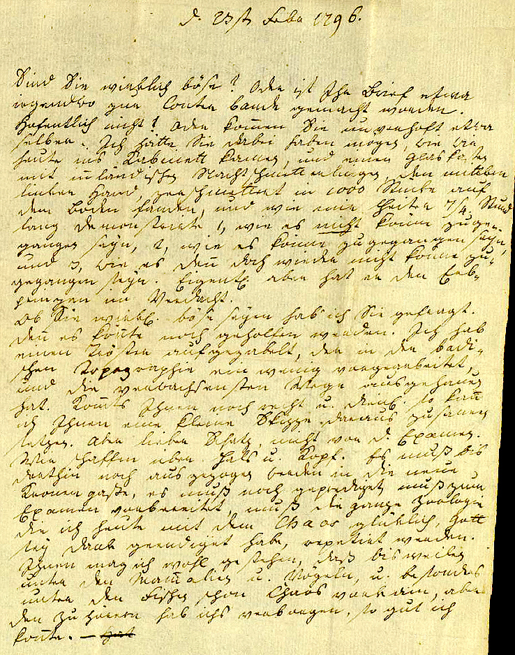 d. 23stn Febr 1796. Sind Sie wirklich böse? Oder ist Ihr Brief etwa irgendwo zur Contre bande gemacht worden. Hofentlich nicht! Oder komen Sie unverhoft etwa selber. Ich hätte Sie dabei haben mögen, wie wir heute ins Kabinett kamen, und einen Glaskasten mit inländischen Nachtschmetterlingen, den mittleren linker Hand, zerschmettert in 1000 Stücke auf dem Boden fanden, und wie mir Heiter 7/4 Stund lang demonstrirte 1, wie es nicht köne zugegan- gen seyn, 2, wie es könne zugegangen seyn, und 3, wie es den doch wieder nicht köne zu- gegangen seyn. Eigentlich aber hat er den Erb- prinzen im Verdacht. Ob Sie wirklich böse seyen hab' ich Sie gefragt. Den es könte noch geholfen werden. Ich hab einen Tröster aufgegabelt, der in der badi- schen Topographie ein wenig vorgearbeitet, und die verwachsensten Wege ausgehauen hat. Komts Ihnen noch recht u. dienlich, so kan ich Ihnen eine kleine Skizze daraus zusamen setzen. Aber lieber Schatz, nicht vor d. Examen. Wir schaffen über Hals und Kopf. Es muß bis dorthin noch aus gezogen werden in die neue Kronengaße, es muß noch geprediget, muß zum Examen vorbereitet, muß die ganze Zoologie die ich heute mit dem Chaos glüklich, Gott sey Dank geendiget habe, repetirt werden. Ihnen mag ich wohl gestehen, daß bisweilen unter den Mamalien u. Vögeln, u. besonders unter den Fischen schon Chaos vorkam, aber den Zuhörern habs ich verborgen, so gut ich konte. — |