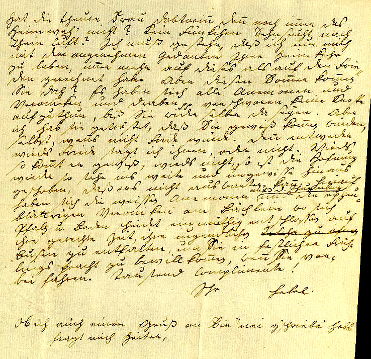 Hat die theure Frau Doktorin den noch imer das Heimweh nicht? Kein Fünkchen Sehnsucht nach Rhein luft? Ich muß gestehn, daß ich um mich mit dem angenehmen Gedanken Ihrer Heimkehr zu laben, imer mehr auf dieses als auf den Frie- den gerechnet habe. Aber diesen Somer komen Sie doch? Es haben sich alle Anemonen und Veroniken und Draben etc. verschworen keine Knospe auf zu thun, biß Sie wieder selber da seyen. Aber ich hab sie getröstet, daß Sie gewiß komen würden, selbst, wens nicht Fride würde. Den entweder wirds Friede sagt ich ihnen, oder nicht. Wirds, so komt er gewiß, wirds nicht, so ist die Hofnung wieder so sehr ins weite und ungewisse hinaus geschoben, daß ers nicht auswarten kan. Hierauf haben sich die weißen Anemonen √ und die epheu- √ auf dem Thurmberg blättrigen Veroniken am Bächlein wo sich Pfalz u. Baden scheidet einmüthig entschlossen auf ihre gerechte Zeit, ihre iugendlichen Busen zu entfalten, um Sie in festlicher Früh- lings Pracht zu bewillkomen, wen Sie vor- bei fahren. Tausend Complimente ! Ihr Hebel Ob ich auch einen Gruß an Sie „nei g'schrieba" hebb, fragt mich Heiter, |