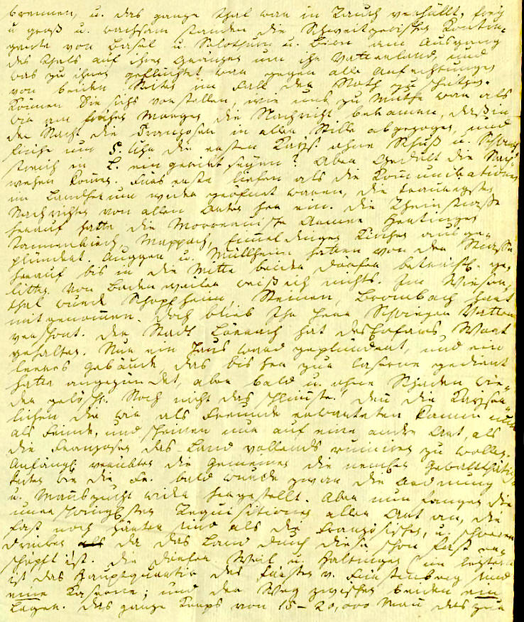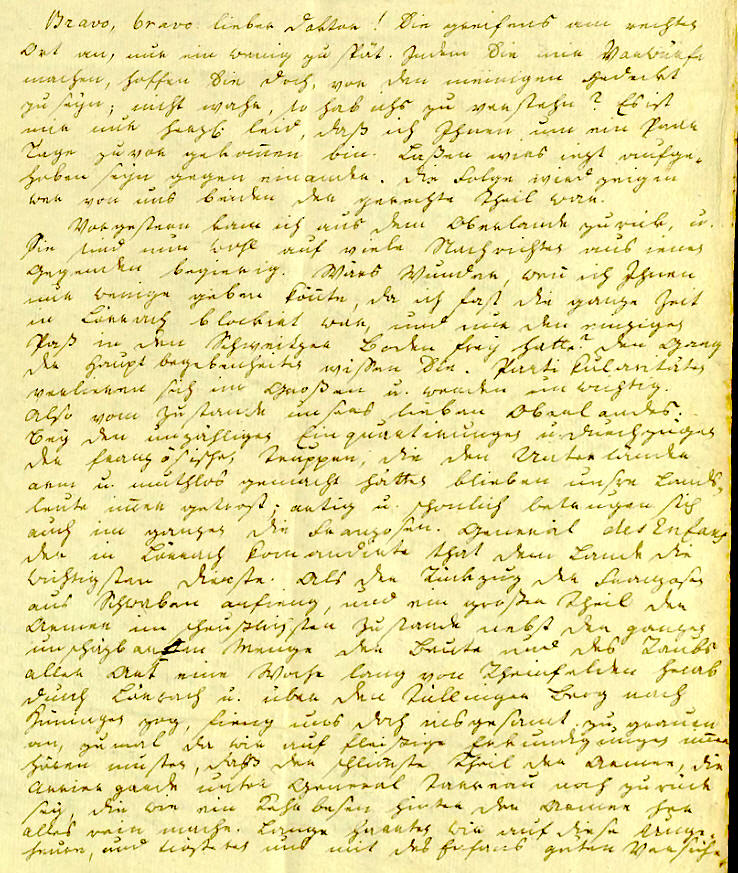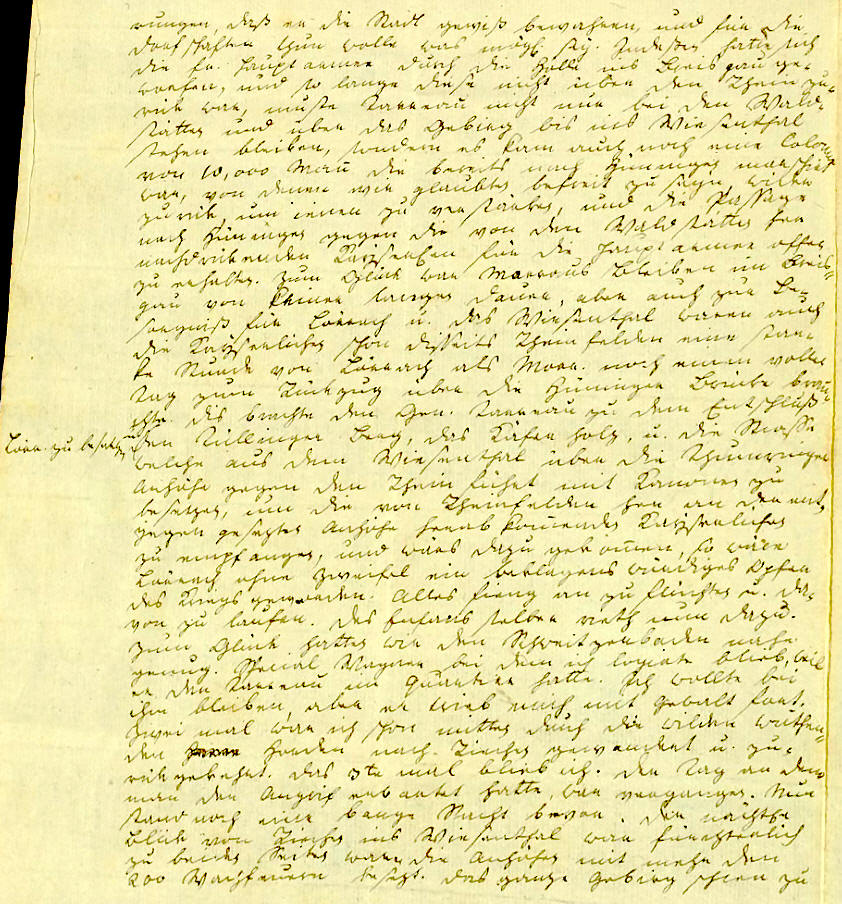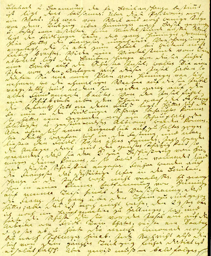 Blokade u. Berennung der fr. Brückenschanze bestimt ist ligt dort beisamen: Ueber diese Positionen noch ein Wort. Ich war von Weil aus noch wenige Tage vor dem Rückzug über Hüningen nach Basel gegangen u. besah iene Anstalten. Eine Viertelstunde ausser Weil ligt der Fridlinger Rein, der ganz Hüningen dominirt. Hier hatten die Franzosen ungeheure Verschanzungen angelegt, die sie aber zum Glück bei weitem nicht fertig brachten. Wider eine Viertelstunde vom Rein abwärts liegt die Brückenschanze von dieser führet eine Brücke auf die Schuster Insel; wollen Sie eine Idee von den Anlagen auf dieser Insel haben so dürfen Sie nur einen Plan von Hüningen vor sich nehmen, wo die ehmaligen Werker auf dieser Insel vorgestellt sind, in dem sie wider ganz auf die alten Fundamente bauten. Von der Insel führt eine Schifbrücke über den Rhein nach der Festung die bekantlich hart an dem Fluß ligt. Hätten sich die Fr. nun in der Fridlinger Schanze behaupten können so hätten iene Gegenden noch ein Schauplatz der blutigsten u. zerstörendsten Aktionen werden können. Aber ohne sich einen Augenblick auf zu halten zogen sie durch, warfen sich in die Festung, und über- ließen den Fridl. Posten ihren Feinden. Jezt werden die Anlagen dort mit der größten Thätigkeit so verändert, daß sie den K. zur Beschießung von Hü- ningen dienen können, u. so bald sie vollendet sind wird dieses Schauspiel angehen. Früher werden auch die Franzosen das disseitige Ufer in der Brücken- schanze u. die Insel wohl nicht verlassen. Es gieng schon in einer kleinen Entfernung von Hüningen auf meiner Reise hinab die Versicherung, daß die Franz. sich ganz über den Rhein zurückgezogen hätten; aber das ist noch nicht wahr, den 29sten war ich noch im Hauptquartier zu Haltingen, sah und hörte die Schuße die sie von der Insel aus auf die Arbeiten am Fridl. Rein thaten, reiste am Sontag d. 30sten ab, u. hörte die nemliche Canonade noch bis nach Schliengen hinab. Jede Nachricht also die sich von dem gänzlichen Rückzug früher datirt ist absolut falsch. Aber gewiß muß er bald folgen. |