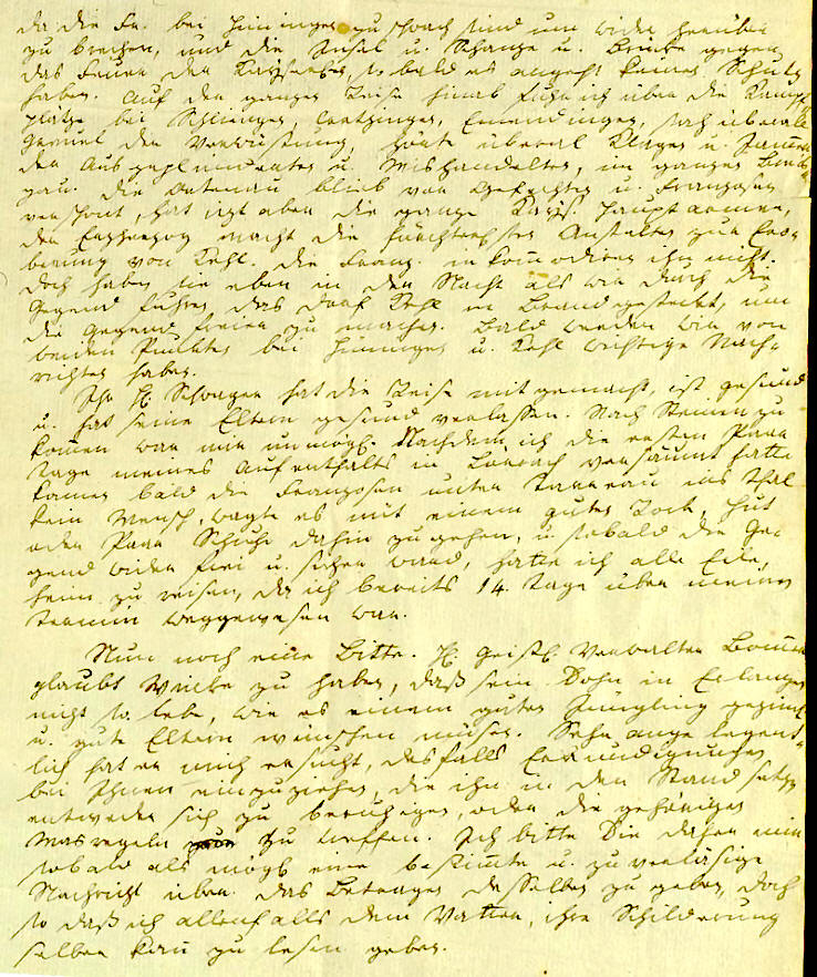 Da die Fr. bei Hüningen zu schwach sind um wider herüber das Feuer der Kayserlichen, so bald es angeht keinen Schutz haben. Auf der ganzen Reise hinab fuhr ich über die Kampf- plätze bei Schliengen, Crotzingen, Emendingen, sah überall Greuel der Verwüstung, hörte überall Klagen u. Jamer der Ausgeplünderten u. Mishandelten, im ganzen Breis- gau. Die Ortenau blieb von Gefechten u. Franzosen verschont, hat iezt aber die ganze Kays. Hauptarmee, der Erzherzog macht die fürchterlichsten Anstalten zur Ero- berung von Kehl. Die Franz. inkomodiren ihn nicht. Doch haben sie eben in der Nacht als wir durch die Gegend fuhren das Dorf Kehl in Brand gesteckt, um die Gegend freier zu machen. Bald werden wir von beiden Punkten, bei Hüningen u. Kehl wichtige Nach- richten haben. Ihr H. Schwager hat die Reise mit gemacht, ist gesund u. hat seine Eltern gesund verlassen. Nach Steinen zu komen war mir unmöglich. Nachdem ich die ersten Paar Tage meines Aufenthalts in Lörrach versäumt hatte kamen bald die Franzosen unter Tarreau ins Thal kein Mensch, wagte es mit einem guten Rock, Hut oder Paar Schuhe dahin zu gehen, u. sobald die Ge- gend wieder frei und sicher ward, hatte ich alle Eile, heim zu reisen, da ich bereits 14 Tage über meinen Termin weggewesen war. * Nun noch eine Bitte. H. Geistlicher Verwalter Bomer glaubt wieder zu haben, daß sein Sohn in Erlangen nicht so lebe, wie es einem guten Jüngling geziemt u. gute Eltern wünschen müsen. Sehr angelegent- lich hat er mich ersucht, desfalls Erkundigungen bei Ihnen einzuziehen, die ihn in den Stand setzen entweder sich zu beruhigen, oder die gehörigen Masregeln zu treffen. Ich bitte Sie daher um sobald als möglich eine bestimte u. zuverläsige Nachricht über das Betragen desselben zu geben, dah so daß ich allenfalls dem Vatter, ihre Schilderung selber kan zu lesen geben. * |