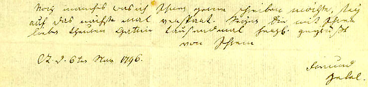 Noch manches was ich Ihnen gerne schreiben möchte, sey lieben theuren Gattin tausendmal herzlich gegrüßt von Ihrem CR. d. 6ten Nov. 1796. Freund Hebel |