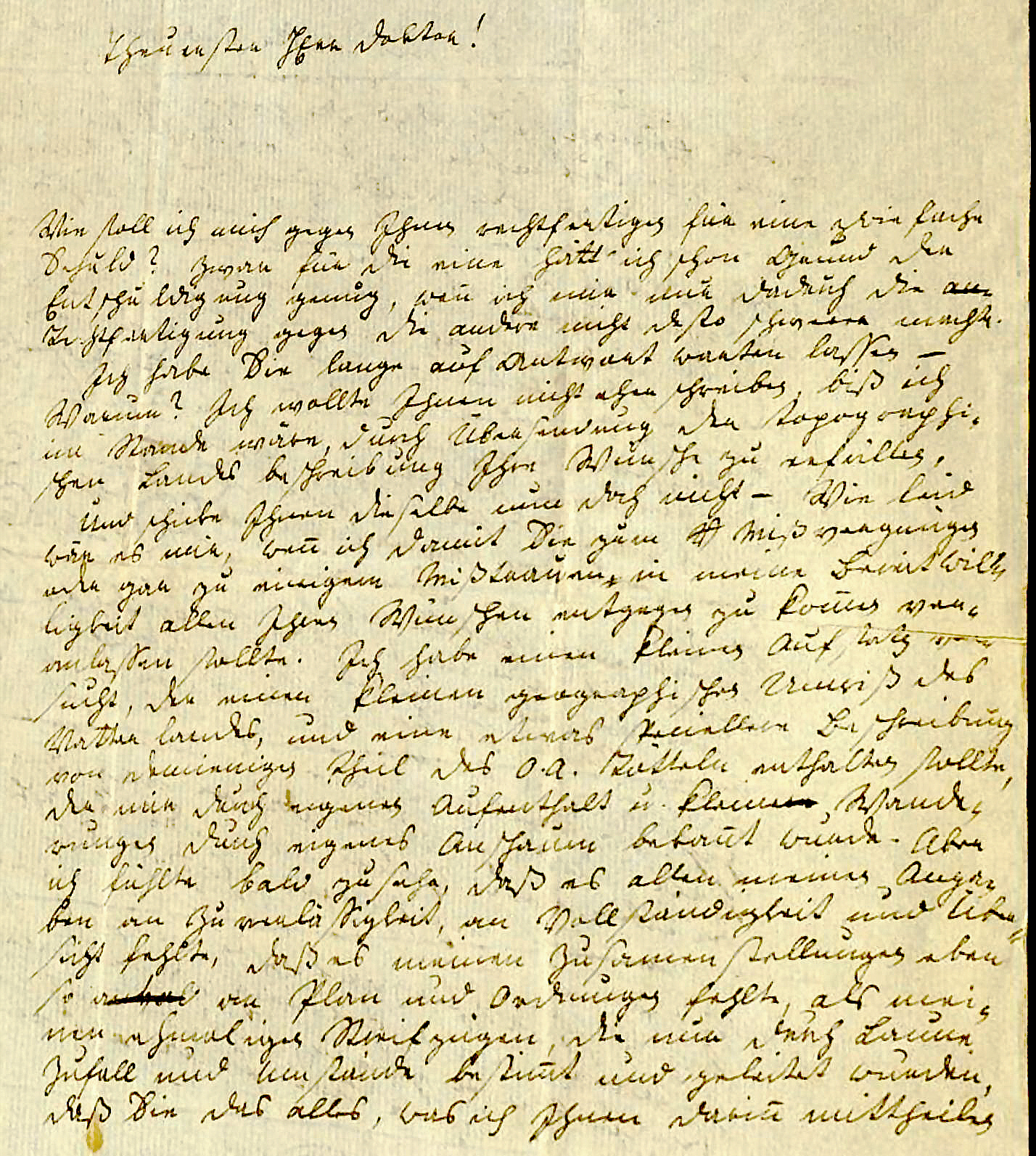 Theuerster Herr Doktor! Wie soll ich mich gegen Ihnen rechtfertigen für eine zwiefache Schuld? Zwar für die eine hätt' ich schon Grund der Entschuldigung genug, wen ich mir nur dadurch die Rechtfertigung gegen die andere nicht desto schwerer machte. Ich habe Sie lange auf Antwort warten lassen — Warum? Ich wollte Ihnen nicht eher schreiben, biß ich im Stande wäre, durch Uebersendung der topographi- schen Landes beschreibung Ihre Wünsche zu erfüllen, und schicke Ihnen dieselbe nun doch nicht - Wie leid wäre es mir, wen ich damit Sie zum Mißvergnügen oder gar zu einigem Mißtrauen in meine Bereitwil- ligkeit allen Ihren Wünschen entgegen zu komen ver- anlassen sollte. Ich habe einen kleinen Aufsatz ver- sucht, der einen kleinen geographischen Umriß des Vatter landes, und eine etwas speciellere Beschreibung von demienigen Theil des O A. Rötteln enthalten sollte, der mir durch eigenen Aufenthalt u. kleine Wande- rungen durch eigenes Anschauen bekant wurde. Aber ich fühlte bald zu sehr, daß es allen meinen Anga- ben an Zuverlässigkeit, an Vollständigkeit und Ueber- sicht fehlte, daß es meinen Zusamenstellungen eben so an Plan und Ordnungen fehlte, als mei- nen ehemaligen Streifzügen, die nur durch Laune Zufall und Umstände bestimt und geleitet wurden, daß Sie das alles, was ich Ihnen darin mittheilen |