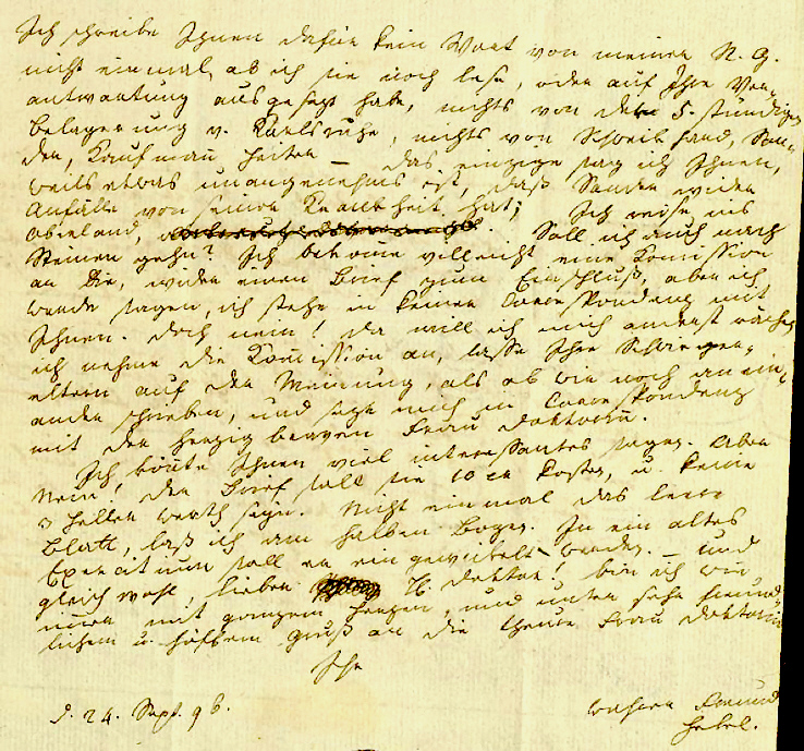 Blatt, laß ich am halben Bogen. In ein altes Exercitium soll er ein gewickelt werden. — und gleichwohl, lieber immer mit ganzem Herzen, und unter sehr freund- lichem u. höflichem Gruß an die theure Frau Doktorin Ihr d. 24. Sept. 96. wahrer Freund Hebel |