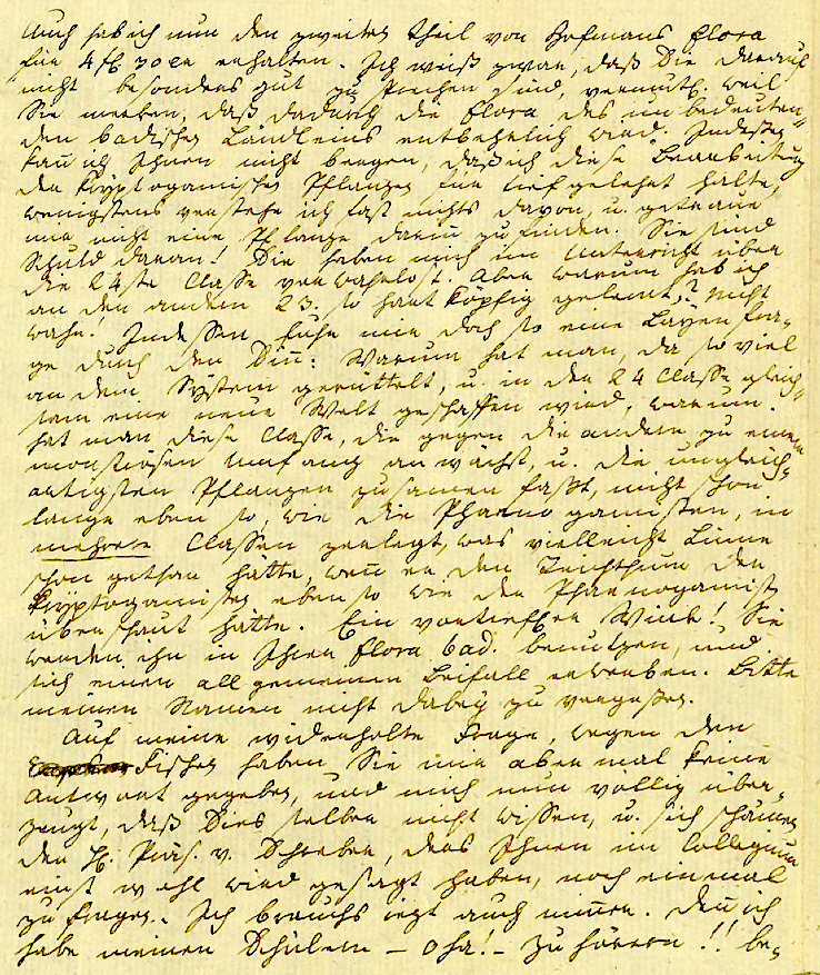 seinem Vatter. Daß wir beide am Zweibrückischen Hof wider einen neuen festen Fuß bekomen, werden Sie wohl wissen. — Aber was wird die Veränderung in Rußland für Folgen haben? Dank soll der Eisman haben, wen er so oder anderst zu einem baldigen guten Frieden, u. mir zu dem großen Vergnügen verhilft, Sie bald wider daheim zu haben. ¬ Wie schlagts den den Altdorfer Professoren in Erlangen zu, lieber Doktor ! Sie werden doch bereits alle da seyn. Lesen sie gut u. fleißig? Ist das Nürnberger Zeughaus auch schon nach Potsdam abgeführt? Und schme- ken euerm lieben König die Nürnberger Lebkuchen wohl? Noch ein Fund, der Ihnen das Heimgehn von Erlangen seiner Zeit erleichtern soll. Wie er schon die Ohren spizt — Meinen Sie ich habe eine Peloria anectaria, aphylla, acaulis ent- deckt? Etwas bessers Lieber ! Worauf Sie den Mund spitzen sollen. Köstlichen Steinwein hab ich an einer nahen Quelle entdeckt — und Est — meiner Seele! Est !!! Gelt, wen Er ge- schwinde wüsste wo? Daß Er ihn unterwegs schon versuchen könte. Aber nein — Er soll den ersten bei mir trinken. — Oder wen Sie hübsch artli sind, und mir Awis geben, so kom ich Ihnen dorthin entgegen. Viel tausend herzliche Empfehlungen an die theure Frau Dokt. Assa ! Adis ! Ihr D. 8ten Dez. 1796. Hebel. |