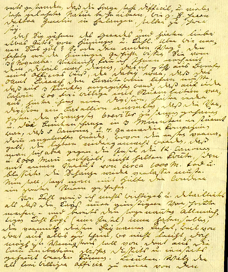 reits gestanden, daß die Frage sehr difficil, u. vielen sehr gelehrten Natur beschreibern, wie z. B. Herrn Doktor Gmelin in Erlangen, selber zu schwer sey. ¬ Doch Sie gähnen ob des Geredes und hörten lieber etwas Gutes von Hüningen u. Kehl. Aber wie nen- nen Sies gut? So oder den andern Weg? Den Erfolg von der Hüninger Geschichte wissen Sie vom 30. November. Vielleicht kann ich Ihnen noch mit dem Detail nach dienen, das ich z. Thl. aus Briefen eines Officirs weiß, der dabey war, daß das OAmt Lörrach den Brante Wein lifern musste, daß auf 3 Punkten angegriffen ward, daß auf ieder Colone 200 Frei Willige mit Sturmleitern vor- aus, hinter ihnen eine Division, hinter ieder Division ein Bataillon anrückte, daß die Vor- posten der Franzosen breviter zusamen gehauen u. die Brückenschanze in 3 Minuten erstürmt war, daß 5 Canonen u. 7 Grenadier Kompagnien drin angetroffen wurden, wovon die ersten verna- gelt, die letztern niedergemacht worden, daß man sich aber gegen die Insel die 12 Canonen und 2000 Man enthielt, nicht halten konte, sdrn mit einem Verlust von circa 1000 M. tod u. blessirten die Schanze wider verlassen muste. Nun soll, sagt man mit Hülfe der Badern ein zweiter Sturm geschehen. Von Kehl weiß ich nichts wichtiges u. detaillirtes als daß die Kays. imer günstigere Vorschritte machen, — und bereits den sogenanten allmäch- tigen Kehl Kopf (eine Insel) inne haben sollen, die vermutlich diesen Beynamen führt, weil von dort aus alles zu thun, wo nicht leicht, doch möglich ist. Wenigstens soll von dort aus die Comunikation zwischen diesseits u. ienseits gehemt werden können. Lieuten. Walz der als freiwilliger Officir zu einer von den |