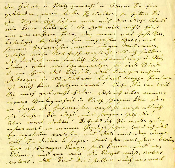 geblieben, mein lieber H. Doktor, so hätten Sie den Vogel, iezt sizt er mir auf dem Dach. Wens nur keine Eule ist! So Gott will nicht; Es ist ein vornehmer Herr, der meine nat. hist. Vor- lesungen besucht. Ein ungrischer Grav, mit seinem Hofmeister, einem jungen Mediciner, welcher mehr Nat. Gesch. versteht, als ich selber. Das fordert nun freilich Vorbereitung und Stu- dium; aber ein Chremnitzer für iede Stunde und am Ende des Kursus das Burgerrecht in Debrezin und 100 Dukaten lebenslängliche Pension ist auch kein Katzendreck! Sehn Sie wie weit Sie mich gebracht haben, daß ich über meine eigene Verlegenheit u. Noth scherzen kan. Den im Ernst, der Hofmeister versteht mehr als ich. Da lachen Sie dazu, und sagen: Hilf Dir! Aber wart' Doktor! Sobald ich Sie wieder zum erstenmal in meiner Predigt sehe, werd ich das Evangelium verlesen, und dann mit dem Finger auf Sie deuten und sagen: dort der mit dem blauen Rock und schwarzen Kragen soll komen, unds er- klären, und wer auf die Kanzel muß, nolens volens , das sind Sie! sollen auch einmal |