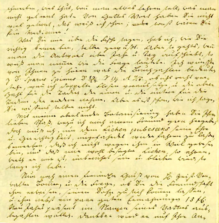 schmecken, wies thut, wen man etwas lehren soll, was man nicht gelernt hat — Von Gottes Wort haben Sie nicht viel gelernt, das weiß ich schon; sonst wären Sie kein Mediciner! Was Sie mir über die Fische sagen, hab ich, wie Sie richtig bemerken, selber gewußt. Aber so gehts, wen man die Antwort über Jahr und Tag aufschiebt, so weiß man nimer wie die Frage lautete. Ich wünschte von Ihnen zu hören was die Bruchzahlen bedeuten z. B. Sparus Spinus D 13/23 V 11/5 A 1/16 ob ichs recht ver- stehe, wen ich doppelte Flosen voraussetze, u. die obere Zahl für die Radien der einen u. die untere für die Radien der andern nehme. Aber es ist schon, wie ich sage Sie wissens selber nicht. Mit meiner oberländer Botanisirung haben Sie Ihren lieben Spaß, wozu ich mich einem Freund gern hergebe; doch muß ich, um dem Lichen pubescens seine Ehre u. Gerechtigkeit, ungefährdet widerfahren zu laßen, bemerken, daß ich nicht wegen ihm in Weil gewesen bin, und daß mir wohl besagter Lichen, so ehren- werth er mir ist, unberührt sein und bleiben wird, so lange ich lebe. Nun noch einen freundlichen Gruß vom H. Geist. Ver- walter Bomer, u. die Frage, ob Sie die Freundschaft ihm erweisen, seinen Sohn zu sich komen lassen, und ihm nebst ein paar guten Ermahnungen 15 fl. Neujahrspräsent im Namen seines Vatters aus- bezahlen wollen. Dankbar wird er auf Ihre An- |