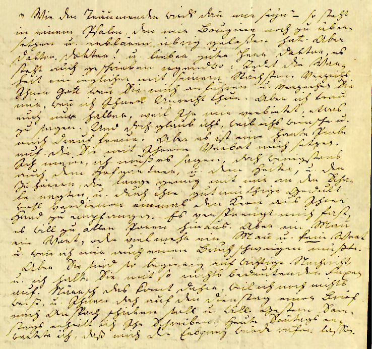 „Wie den Träumenden wirds dan mir seyn" — so steht in einem Psalm, den mir Bougine noch zu über- setzen und erklären übrig gelassen hat. Aber Doktor, Doktor! u. lieber guter Herr Doktor, es steht auch geschrieben irgendwo: Redet die War- heit ein ieglicher mit seinem Nächsten. Verzeihs Ihnen Gott, wen Sie mich anführen, u. verzeihen Sie mir, wen ich Ihnen Unrecht thue. Aber ich trau euch nur halber, weil Ihr mir verbietet etwas zu sagen. Und doch glaub ichs, weil ichs wünsche u. mich drauf freue. Aber es ist eine harte Probe auf die Sie mit Ihrem Verbot mich setzen. Ich meine, ich muß es sagen, doch wenigstens auch dem Hofgärtner u. dem Heiter, u. den Zuhörern, die lange genug mit mir an der Scha- le nagten, u. durch ihre gutmüthige Geduld wohl verdienen einmal den Kern aus Ihrer Hand zu empfangen. Es versprengt mich fast, es will zu allen Poren hinaus. Aber ein Man ein Wort, oder vielmehr ein Man u. kein Wort u. wen ich mir auch einen Bruch schweigen müßte. Aber Sie sind so begierig auf wichtige Nachricht, u. ich halte Sie mit so nichts bedeutenden Faxen auf. Närrisch das komt daher, weil ich noch nichts weiß, u. Ihnen doch auf den Dienstag einen Brief nach Anspach schicken soll u. will. Gestern Sam- stags erhielt ich Ihr Schreiben. Heute Sontags er- wartete ich, daß mich der Erbprinz würde rufen lassen. |