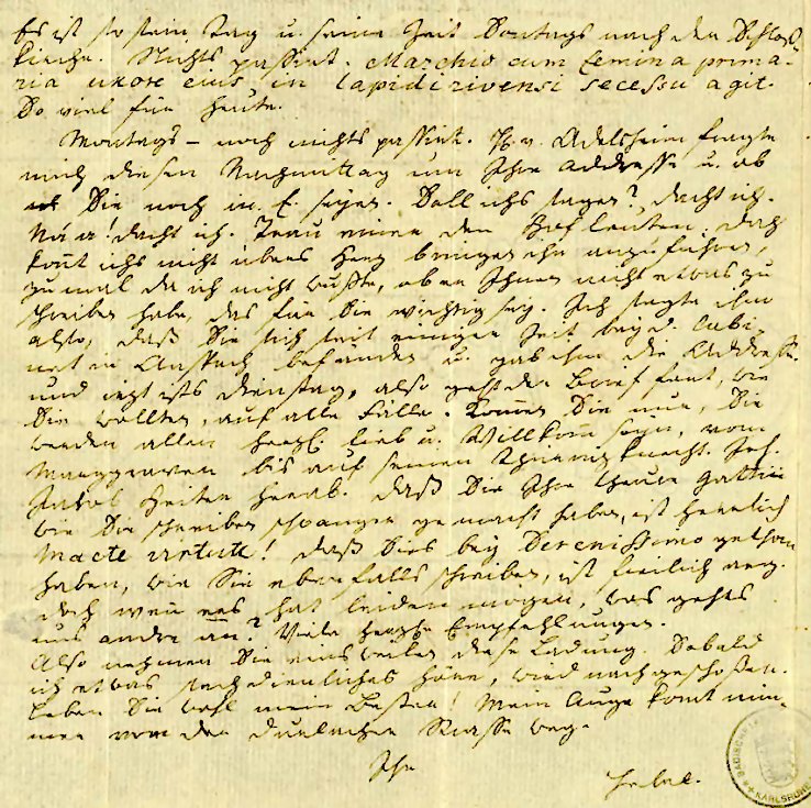 Ná a! dacht ich. Trau einer den Hofleuten. Doch könt ichs nicht übers Herz bringen ihn anzuführen, zumal da ich nicht wußte, ob er Ihnen nicht etwas zu schreiben habe, des für Sie wichtig sey. Ich sagte ihm also, daß Sie sich seit einiger Zeit bey d. Cabi- net in Anspach befänden u. gab ihm die Adresse, und iezt ists Dienstag, also geht der Brief fort, wie Sie wollten, auf alle Fälle. Komen Sie nur, Sie werden allen herzlich lieb u. Willkom seyn, vom Marggraven bis auf seinen Thürnizknecht Joh. Jakob Heiter herab. Daß Sie Ihre theure Gattin, wie Sie schreiben schwanger gemacht haben, ist herrlich. Macte virtute! Daß Sies bey Serenissimo gethan haben, wie Sie ebenfalls schreiben, ist freilich arg. Doch wen ers hat leiden mögen, was gehts uns andre an? Viele herzliche Empfehlungen. Also nehmen Sie einsweilen diese Ladung. Sobald ich etwas sachdienliches höre, wird nachgeschoßen. Leben Sie wohl, mein Bester! Mein Auge komt nim- mer von der Durlacher Straße weg. Ihr Hebel |
