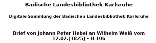 Lorbeer umschattet sein Haupt. Dis ist, bester Herr Regierungs- rath, der Gang u. Inhalt des Ge- dichtes, und ich weiß nicht, ob die Verarbeitung dieser Ideen, so schön sie an sich lauten, eine wörtliche Übersetzung tragt, indem fasser in den Schranken des Me- trums gar sonderbar windet, wäre aber, wie es sich von selbst versteht, dazu in dem Augen- blick bereit, so bald Sie mir sagen, daß S. K. H. es zu ver- langen scheinen. Mit iniger Hochachtung u Liebe Ihr d. 12 tn Febr. * ergebenster Hebel |