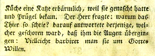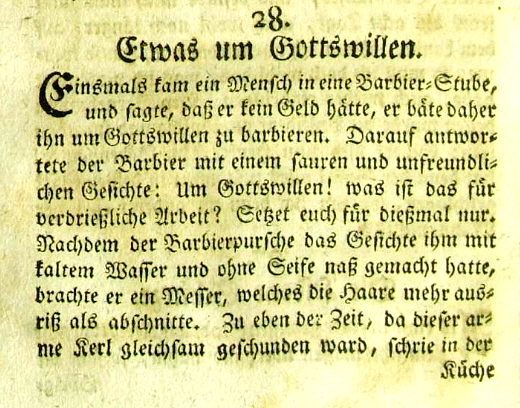 genascht hatte und Prügel bekam. Der Herr fragte: warum das Thier so schrie? darauf antwortete derjenige, wel- cher geschoren ward, daß ihm die Augen übergin- en: Vielleicht barbiret man sie um Gottes Willen. |