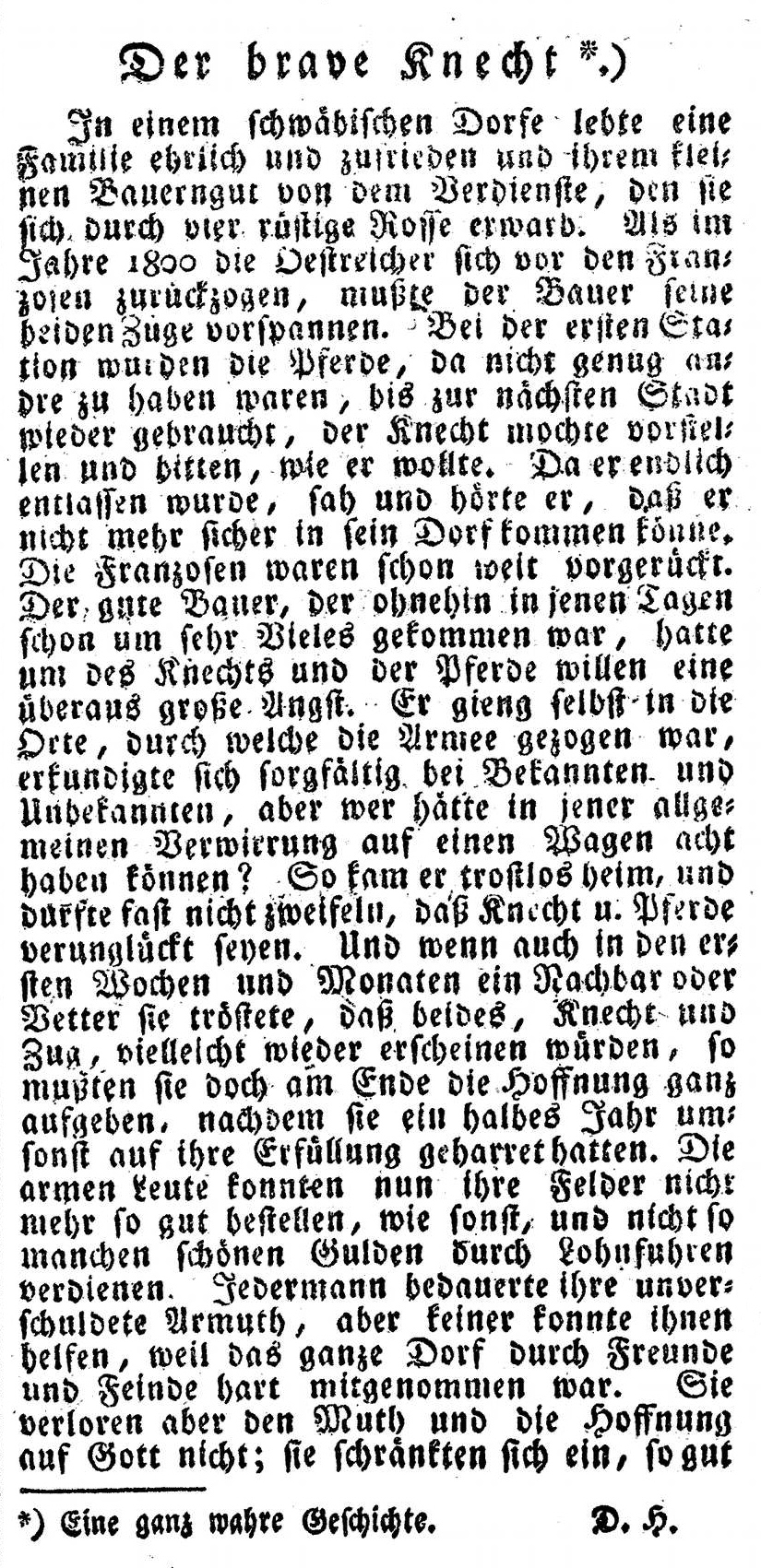 Der brave Knecht *. In einem schwäbischen Dorfe lebte eine Famille ehriich und zufrieden und ihrem klei- nen Bauerngut von dem Verdienste, den sie sich durch vier rüstige Rosse erwarb. Als im Jahre 1850 die Oestreicher sich vor den Fran- zosen zurückzogen, mußte der Bauer seine beiden Züge vorspannen. Bei der ersten Sta- tion wurden die Pferde, da nicht genug an- dre zu haben waren, bis zur nächsten Stadt wieder gebraucht, der Knecht mochte vorstel- len und bitten, wie er wollte. Da er endlich entlassen wurde, sah und hörte er daß er nicht mehr sicher in sein Dorf kommen könne. Die Franzosen waren schon weit vorgerückt. Der, gute Bauer, der ohnehin in jenen Tagen schon um sehr Vieles gekommen war, hatte um des Knechts und der Pferde willen eine überaus große Angst. Er gieng selbst in die Orte, durch welche die Armee gezogen war, erkundigte sich sorgfältig bei Bekannten und Unbekannten, aber wer hätte in jener allge- meinen Verwirrung auf einen Wagen acht haben können? So kam er trostlos heim, und durfte fast nicht zweifeln, daß Knecht u. Pferde verunglückt seyen. Und wenn auch in den er- sten Wochen und Monaten ein Nachbar oder Vetter sie tröstete, daß beldes, Knecht- und Zug, vielleicht wieder erscheinen würden, so mußten sie doch am Ende die Hoffnung ganz aufgeben, nachdem sie ein halbes Jahr um- sonst auf ihre Erfüllung geharret hatten. Die armen Leute konnten nun ihre Felder nicht mehr so gut bestellen, wie sonst, und nicht so manchen schönen Gulden durch Lohnfuhren verdienen. Jedermann bedauerte ihre unver- schuldete Armuth, aber keiner konnte ihnen helfen, weil das ganze Dorf durch Freunde und Feinde hart mitgenommen war. Sie verloren aber den Muth und die Hoffnung auf Gott nicht; sie schränkten sich ein, so gut ________________________ *) Eine ganz wahre Geschichte. D. H. |