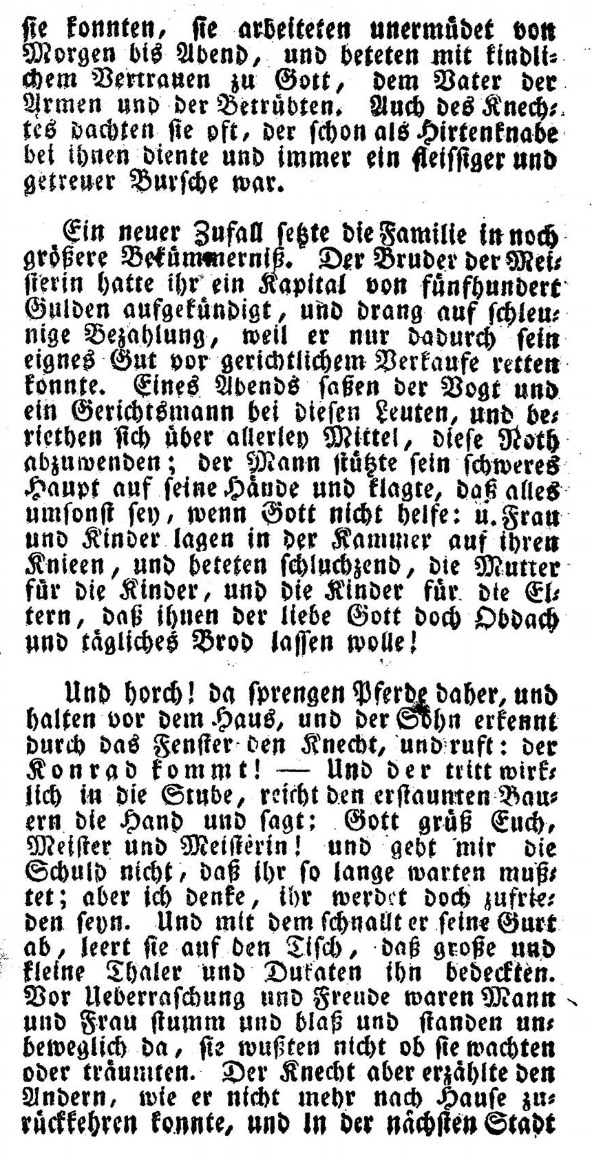 sie konnten, sie arbeiteten unermüdet von Morgen bis Abend, und beteten mit kindli- chem Vertrauen zu Gott, dem Vater der Armen und der Betrübten. Auch des Knech- tes dachten sie oft, der schon als Hirtenknabe bei ihnen diente und immer ein fleissiger und getreuer Bürsche war. Ein neuer Zufall setzte die Famille in noch größere Bekümmerniß. Der Bruder der Mei- sterin hatte ihr ein Kapital von fünfhundert Gulden aufgekündigt, und drang auf schleu- nige Bezahlung, weil er nur dadurch sein eignes Gut vor gerichtlichem Verkaufe retten konnte. Eines Abends saßen der Vogt und ein Gerichtsmann bei diesen Leuten, und be- riethen sich über allerley Mittel, diese Noth abzuwenden; der Mann stützte sein schweres Haupt auf seine Hände und klagte, daß alles umsonst sey, wenn Gott nicht helfe: u. Frau und Kinder lagen in der Kammer auf ihren Knieen, und beteten schluchzend, die Mutter für die Kinder, und die Kinder für die El tern, daß ihnen der liebe Gott doch Obdach und tägliches Brod lassen wolle! Und horch! da sprengen Pferde daher, und halten vor dem Haus, und der Sohn erkennt durch das Fenster den Knecht, und ruft: der Konrad kommt! -- Und der tritt wirk- lich in die Stube, reicht den erstaunten Bau- ern die Hand und sagt: Gott grüß Euch. Meister und Meisterin und gebt mir die Schuld nicht, daß ihr so lange warten muß- tet; aber ich denke, ihr werdet doch zufrie den seyn. Und mit dem schnallt er seine Gurt ab, leert sie auf den Tisch, daß große und kleine Thaler und Dutaten ihn bedeckten. Vor Ueberraschung und Freude waren Mann und Frau stumm und blaß und standen un- beweglich da, sie wußten nicht ob sie wachten oder träumten. Der Knecht aber erzählte den Andern, wie er nicht mehr nach Hause zu- rückkehren konnte, und in der nächsten Stadt |