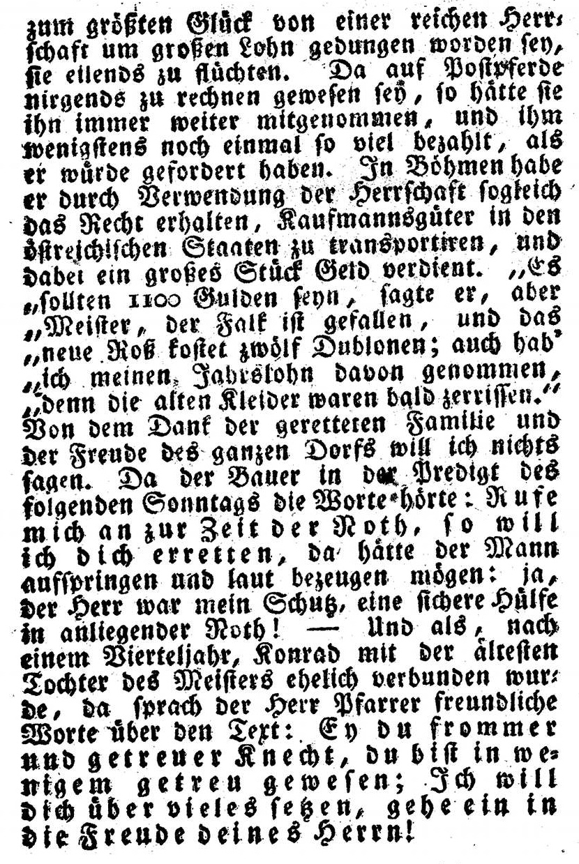 zum größten Glück von einer reichen Herr- schaft um großen Lohn gedungen worden sey, sie eilends zu flüchten. Da auf Postpferde nirgends zu rechnen gewesen sey, so hätte sie ihn immer weiter mitgenommen, und ihm wenigstens noch einmal so viel bezahlt, als er würde gefordert haben. In Böhmen habe er durch Verwendung der Herrschaft sogleich das Recht erhalten, Kaufmannsgüter in den östreichischen Staaten zu transportiren, und dabei ein großes Stück Geld verdient. "Es "sollten 1100 Gulden seyn, sagte er, aber "Meister, der Falk ist gefallen, und das "neue Roß kostet zwölf Dublonen; auch hab "ich meinen. Jahrslohn davon genommen, "denn die alten Kleider waren bald zerrissen." Von dem Dank der geretteten Familie und der Freude des ganzen Dorfs will ich nichts sagen. Da der Bauer in der Predigt des folgenden Sonntags die Worte hörte: Rufe mich an zur Zeit der Roth, so will ich dich erretten, da hätte der Mann aufspringen und laut bezeugen mögen: ja, der Herr war mein Schutz, eine sichere Hülfe in anliegender Noth! -- Und als, nach einem Vierteljahr, Konrad mit der ältesten Tochter des Meisters ehelich verbunden wur- de, da sprach der Herr Pfarrer freundliche Worte über den Text: Ey du frommer und getreuer Knecht, du bist in we- nigem getreu gewesen; Ich will dich über vieles setzen, gehe ein in die Freude deines Herrn! |