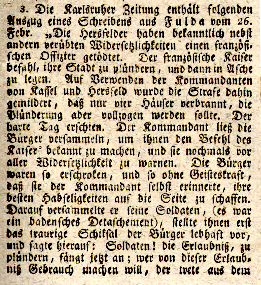 3. Die Karlsruher Zeitung enthält folgenden Auszug eines Schreibens aus Fulda vom 26. Febr. "Die Hersfelder haben bekanntlich nebst andern verübten Widersetzlichkeiten einen französi- schen Offizier getödtet. Der französische Kaiser befahl, ihre Stadt zu plündern, und dann in Asche zu legen. Auf Verwenden der Kommandanten von Kassel und Hersfeld wurde die Strafe dahin gemildert, daß nur vier Häuser verbrannt, die Plünderung aber vollzogen werden sollte. Der harte Tag erschien. Der Kommandant ließ die Bürger versammeln, um ihnen den Befehl des Kaiser bekannt zu machen, und sie nochmals vor aller Widersetzlichkeit zu warnen. Die Bürger- waren so erschroken, und so ohne Geisteskraft, daß sie der Kommandant selbst erinnerte, ihre besten Habseligkeiten auf die Seite zu schaffen. Darauf versammelte er seine Soldaten, (es war ein badensches Detaschement), stellte ihnen erst das traurige Schiksal der Bürger lebhaft vor, und sagte hierauf: Soldaten! die Erlaubniß, zu plündern, fängt jetzt an; wer von dieser Erlaub- niß Gebrauch machen will, der trete aus dem |