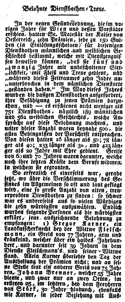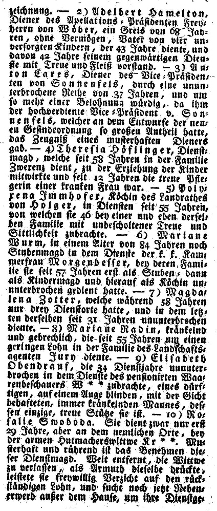 Abelbert Hamelton, Diener des Apellations-Präsidenten Frey- herrn von Wöber, ein Greis von 68 Jah- ren, ohne Vermögen, Vater von vier un- versorgten Kindern, der 43 Jahre diente, und davon 42 Jahre seinem gegenwärtigen Dien- ste mit Treue und Fleiß vorstand. - 3) An ton Cares, Diener des- Vice-Präsiden- ten von Sonnenfels, durch eine unun- terbrochene Reihe von 37 Jahren, und um so mehr einer Belohnung würdig, da ihm der hochverdiente Vice-Präsident v. Son- nenfels, welcher an dem Entwurfe der neu- en Gesindeordnung so großen Antheil hatte, das Zeugniß eines musterhaften Dieners gab. - 4) Theresia Höflinger, Dienst- magd, welche seit 58 Jahren in der Famille Zwerenz dient, zu der Erziehung der Kinder mitwirkte und feit 12 Jahren die treue Pfle- gerin einer kranken Frau war. - 5) Poly- rena Immhofer, Köchin des Landrathes von Holger, in Diensten seit 55 Jahren, von welchen sie 46 bey einer und eben dersel- ben Famille mit unbescholtener Treue und Sittlichkeit zubrachte. - 6) Mariane Wurm, in einem Alter von 84 Jahren noch Stubenmagd in dem Dienste der k. k. Kam- merfrau Morgenbesser, bey deren Fami- lie sie seit 57 Jahren erst als Stuben- dann als Kindermagd und hierauf als Köchin un- unterbrochen gedient hatte. - 7) Magda- lena Zotter, welche während 58 Jahren nur drey Dienstorte hatte, und in dem letz ten derselben seit 31 Jahren ununterbrochen diente. - 8) Mariane Radin, kränkelnd und gebrechlich, die seit 55 Jahren um einen geringen Lohn in der Familie des Landschafts- agenten Jury diente. - 9) Elisabeth Obendrauf, die 34 Dienstjahre ununter- brochen in dem Dienste des pensionirten Waar renbeschauers W * * zubrachte, eines dürf- tigen, auf einem Auge blinden, mit der Gicht behafteten, immer kränkelnden Mannes, des- sen einzige, treue Stütze sie ist. - 10) Ro salie Swoboda. Sie dient zwar nur erst 29 Jahre, aber an dem nemlichen Orte, bey der armen Hutmacherswittwe Kr * *. Mu- sterhaft und rührend ist das Benehmen die- ser Dienstmagd. Welt entfernt, die Wittwe zu verlassen, als Armuth dieselbe drückte, leistete sie freywillig Verzicht auf den rück- ständigen Lohn, und sucht noch jetzt Neben- erwerb außer dem Hause, um ihre Dienstge- |