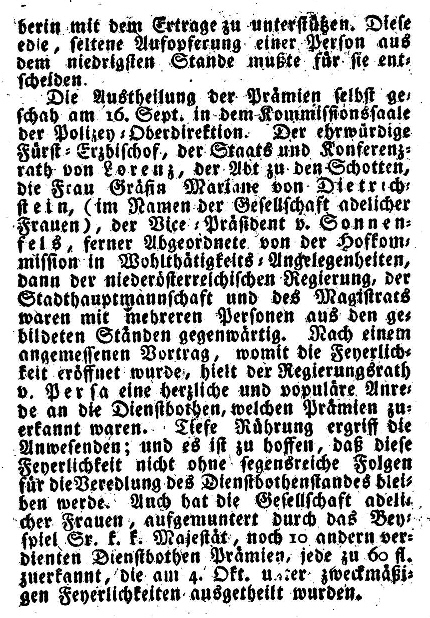Diese edle, seltene Aufopferung einer Person aus dem niedrigsten Stande mußte für sie ent- schelden Die Austheilung der Prämien selbst ge- schah am 16. Sept. in dem Kommissionssaale der Polizey-Oberdirektion. Der ehrwürdige Fürst-Erzbischof, der Staats und Konferenz- rath von Lorenz, der Abt zu den Schotten, die Frau Gräfin Mariane von Dietrich- stein, (im Namen der Gesellschaft adelicher Frauen), der Vice-Präsident v. Sonnen- fels, ferner Abgeordnete von der Hofkom- mission in Wohlthätigkeits- Angelegenhelten, dann der niederösterrelchischen Regierung, der Stadthauptmannschaft und des Magistrats waren mit mehreren Personen aus den ge- bildeten Ständen gegenwärtig. Nach einem angemessenen Vortrag, womit die Feyerlich- keit eröffnet wurde, hielt der Regierungsrath v. Persa eine herzliche und populäre Anre- de an die Dienstbothen, welchen Prämien zu- erkannt waren. Tiefe Rührung ergriff die Anwesenden; und es ist zu hoffen, daß die Feyerlichkeit nicht ohne segensreiche Folgen für die Veredlung des Dienstbothenstandes blei- ben werde. Auch bat die Gesellschaft adelie- cher Frauen, aufgemuntert durch das Bey-- spiel Sr. k. k. Majestät, noch 10 andern ver- dienten Dienstbothen Prämien, jede zu 60 fl zuerkannt, die am 4. Okt. unter zweckmäßi- gen Feyerlichkeiten ausgetheilt wurden. |
