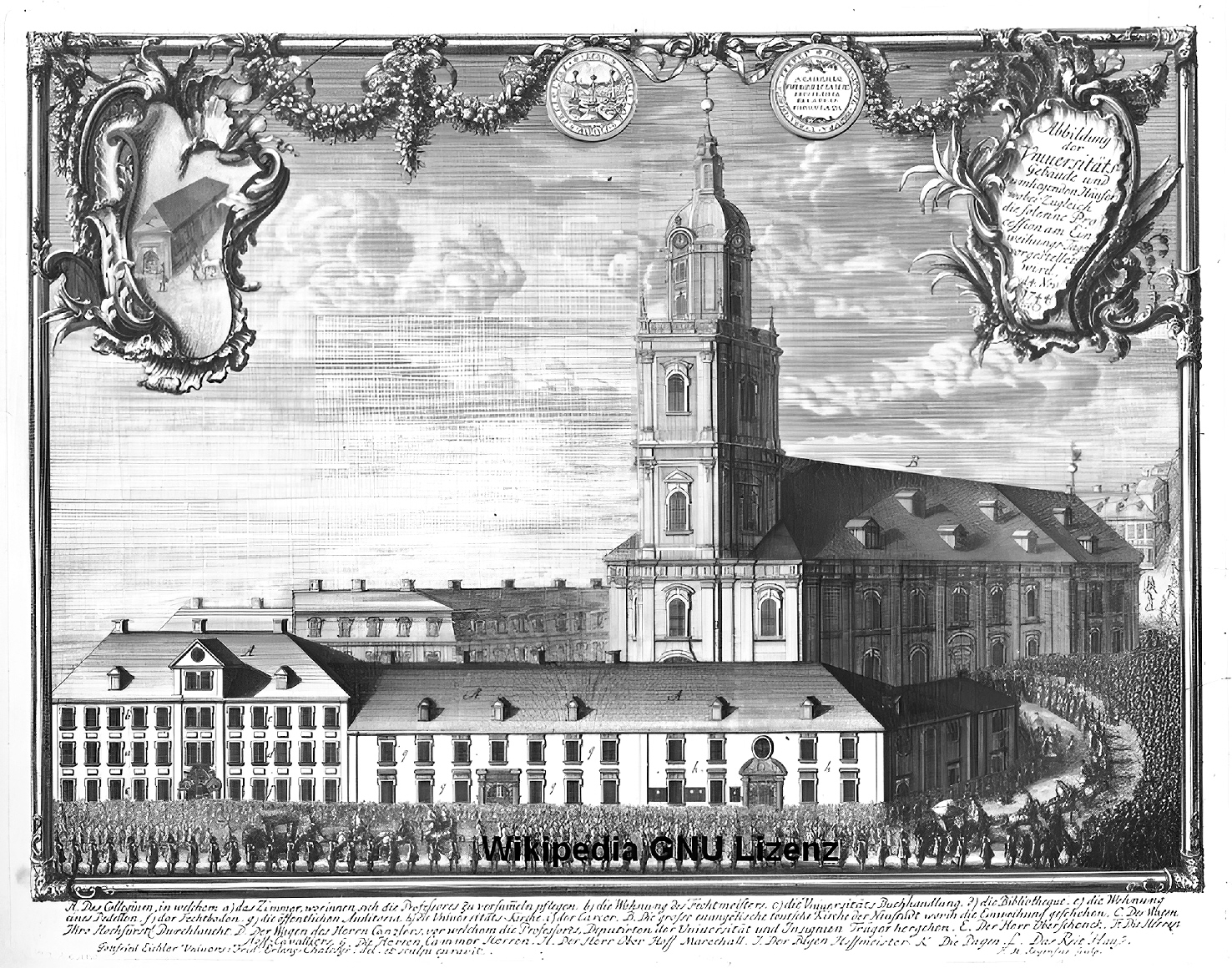 zeitgenössische Darstellung der Einweihungsfeierlichkeiten 1844 A = Die beiden Collegiumsgebäude; B = Die evangelische Kirche |