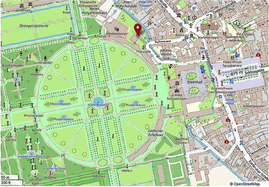 31. Sterbehaus Johann Peter Hebels, dasGesandtenhaus des Schwetzinger Schlosses (ca. 1950). Photo von E. Thome. Stadtarchiv Schwetzingen. Johann Michael Zeyhers Amtswohnung, des Neugestalters der Schloßparkanlagen von Schwetzingen. Im September 1826 begibt sich Hebel, trotz schwerer Krankheit, auf eine Dienstreise zu Prüfungen nach Mannheim. Die Schüler ehren Hebel mit einer Fahrt auf dem Rhein. Anschließend reist er nach Schwetzingen zu einem Besuch des befreundeten Gartendirektors Zeyher. In seiner Wohnung starb Hebel am 22. September 1826 und wurde am folgenden Tag beigesetzt. Rot markiert: Lage der Amtswohnung des Gartendirektors, heute Sitz des Amtsgerichts Schwetzingen in der Zeyherstrasse. |