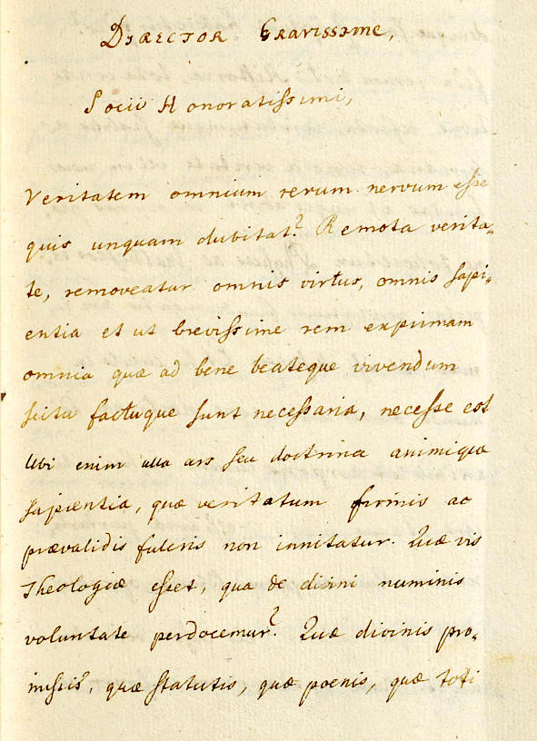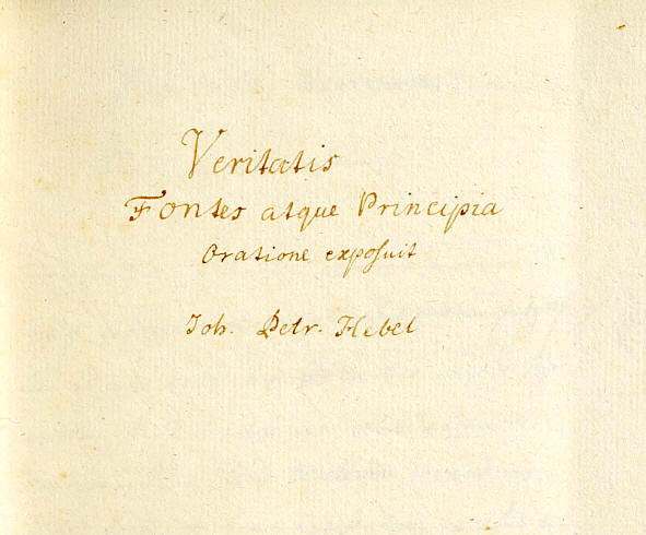1776 wird Hebel Mitglied der „Marchio-Badensis Societas Latina", einer Gesellschaft zur Pflege des Lateins. Hebel hält vier lateinische Reden und erhält den von Erbprinz Karl Ludwig gestifteten Preis von 25 Gulden. Die Themen: „Das Mißtrauen, das leicht aus einem unglücklichen Schicksal hervorgehen kann" „Schaffensfreude und Fröhlichkeit als Zeichen für die guten Anlagen eines Jünglings" „Quellen und Prinzipien der Wahrheit" „Vergleich Cäsars mit Augustus". Der Autograph gibt den Beginn der zweiten Rede wieder: