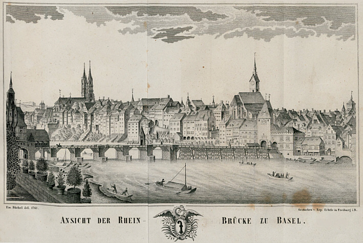 Uf der breite Bruck, für si hi und zruck, nei, was sieht me Here stoh, nei, was sieht me Jumpfere goh, uf der Basler Bruck. Um 1525 erbaut mit 5 Steinpfeilern - bis zum Capelljoch und 8 Holzpfeilern. 1457 folgt der 6. Steinpfeiler, das Bärenfelser Joch (ungefähr in der Flußmitte), der einen Holzpfeiler ersetzt. In dieser, bis 1903 unveränderten Gestalt sah sie auch Hebel während seiner Basler Jahre.