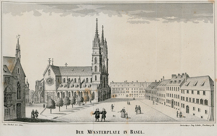 In der Münsterschuel, uf mim herte Stuehl, magi zwor jetz nüt meh ha, d'Töpli stöhn mer nümmen a in der Basler Schuel. (Münsterschuel = das letzte Gebäude an der rechten Platzseite) Im Schuljahr 1772/73 besuchte Hebel eine Klasse der Münsterschule. Töpli = Tatzen = Schläge auf die Handflächen eines Schülers. |