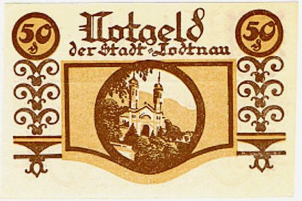 Notgeld der Stadt Todtnau vom Oktober 1921 über 50 Pfennig mit einem Vers J. P. Hebels: "Waisch, wo der Weg zuem Gulden isch? Er goht de rote Chrüzere noh. Und wer nit uf e Chrüzer luegt, der wird zuem Gulde schwerli cho." oben die Rückseite, unten die Vorderseite.